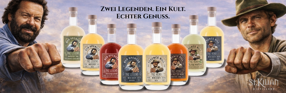 Ihre legendären Rollen, ihre unverwechselbare Art und ihre Freundschaft haben Generationen geprägt. Genau dieser Kult lebt in dieser exklusiven Spirituosen-Kollektion weiter. Gemeinsam mit der renommierten St. Kilian Distillers entstehen hochwertige Whiskys und Liköre, die Charakter zeigen: kraftvoll, mild, rauchig oder cremig – immer mit Persönlichkeit. Jetzt entdecken, probieren und ein Stück Filmlegende genießen.